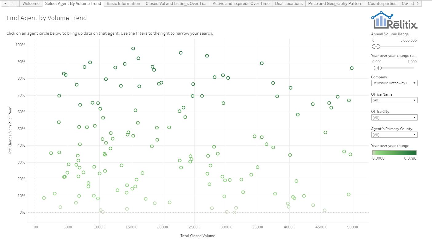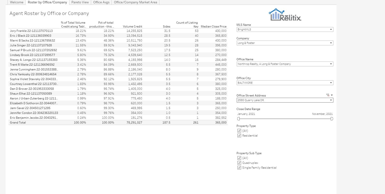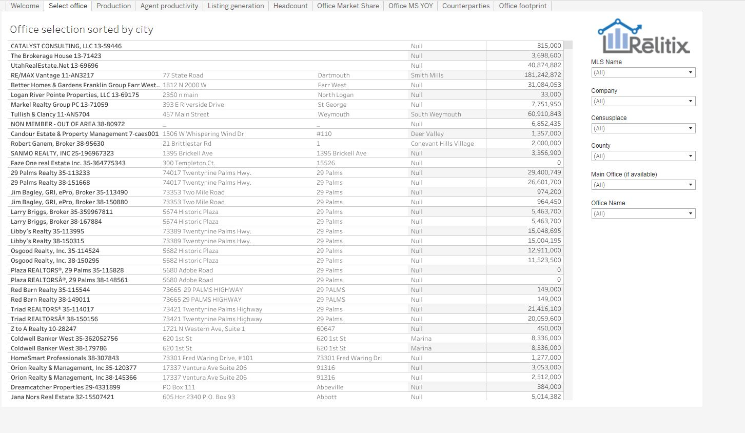 When you open any of these views, you will see various screens. In many of these tools, it will not matter which view you choose. However, in the Find Agent by Volume Trend, Detailed Agent History, Detailed Office History, and the Agent Rosters Workbook, you must always start on the first page. For the Detailed Agent History, Detailed Office History and Find Agent by Volume Trend workbooks, this page is called Select Agent/Office or find agent by volume trend. For agent rosters, the first page is called Roster by Office/Company. You need to begin with these screens in these workbooks because the settings you choose on them drives the data for the rest of the screens.