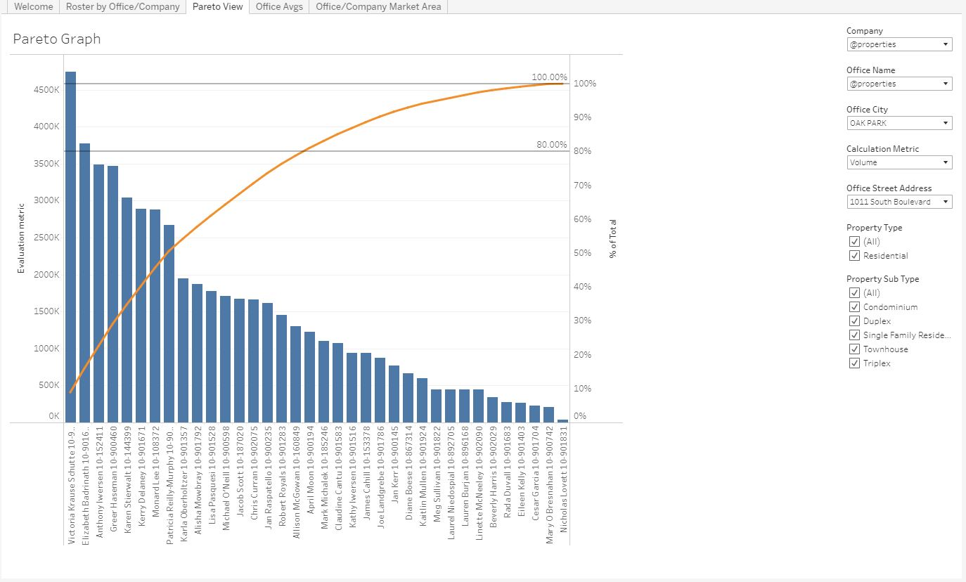 The Pareto principle states that for many outcomes, roughly 80% of effects come from 20% of the causes. We call this the vital few. So this view shows you a chart of the production by agent. This is the exact same as the numbers we saw in the last tab but, this time you have the orange line that represents the running total of volume represented in the second column on the first screen. The steeper this line is, the more concentrated the volume is between agents. The 80% line is here that helps you to see how quickly the office gets to 80% of the production spread across its agents.