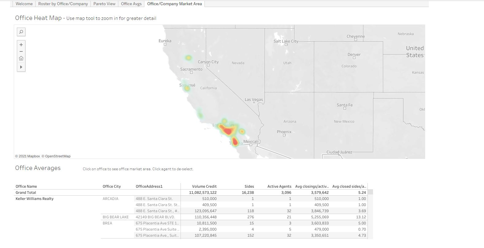 This map helps by showing you the reach of each office. You can go back to the previous screen to change the settings to manipulate what is being shown in this map. You can also click directly on the table below to isolate which offices heat map you are looking at.And as always, you can use the pan and zoom tools in the map toolbar to hone in on certain areas of interest to you.