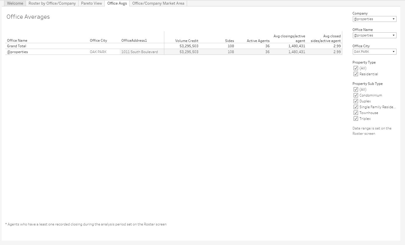 As you can see, right now the only office I have selected is visible. You can see across the top the columns that show the volume in that office, the number of sides and the number of active agents that contributed to that. You can see the active Closings averaged per agent and the average number of sides close per agent we can change.The filters to view the averages of various offices next to each other. If you wanted to see how all of this company's offices are doing and how the company's overall business is distributed along with the grand total on top.You can also isolate these results by property type and subtype, so we could see the business in this particular office with duplexes, for example.