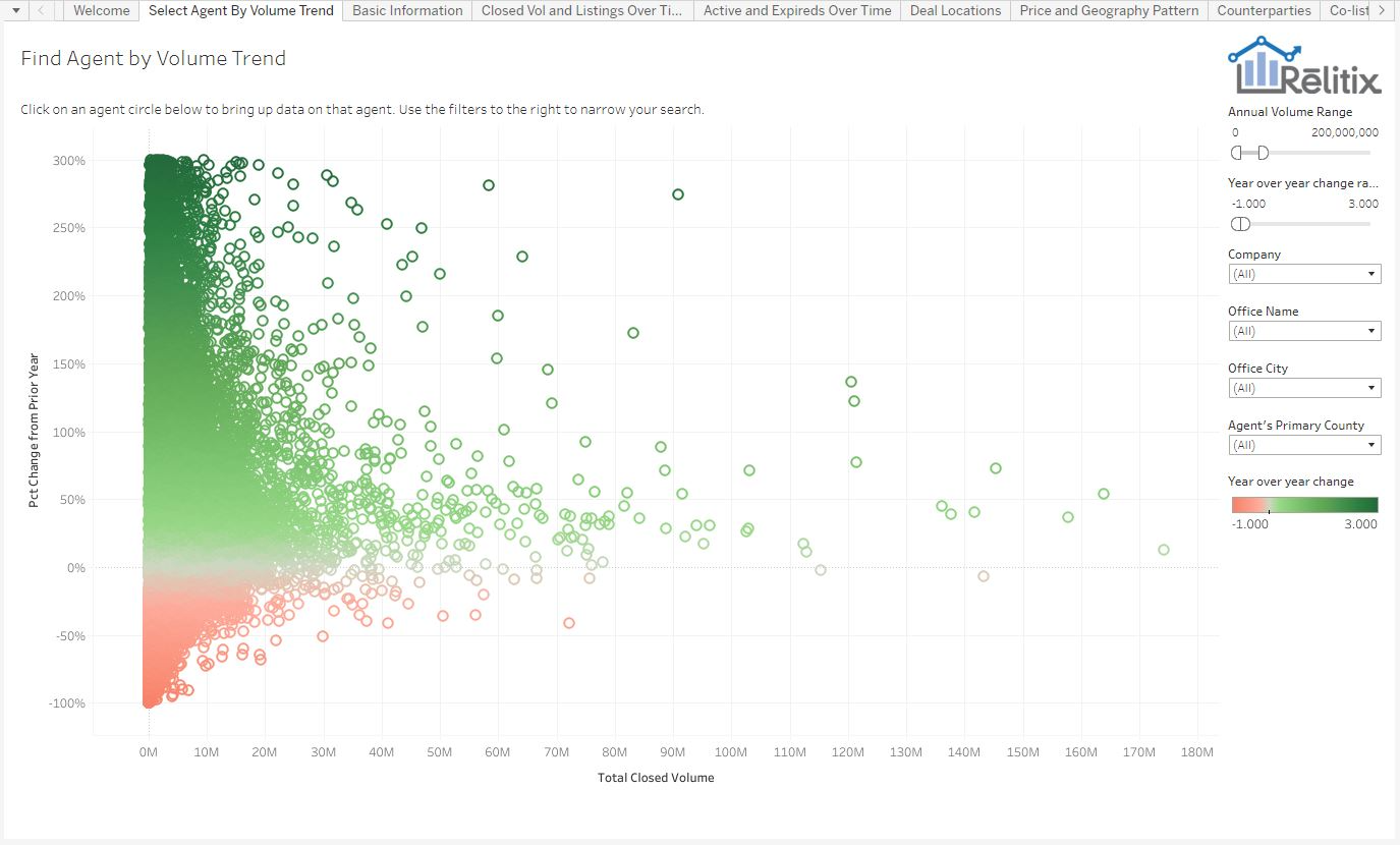 So again, this is a great tool to look up a group of agents by either an office, city or county and see the overall trends, outliers or isolate agents based upon a specific range of volume and increase rate year over year.
