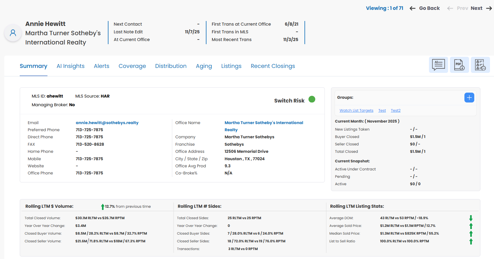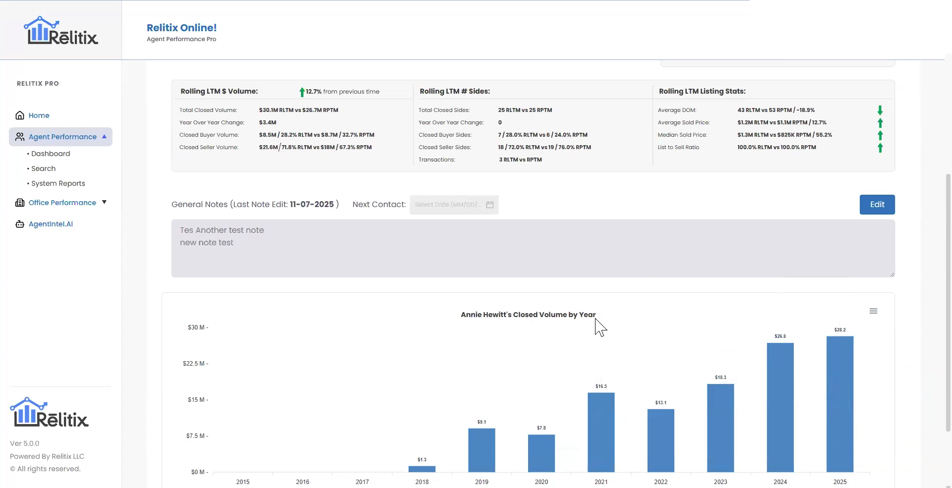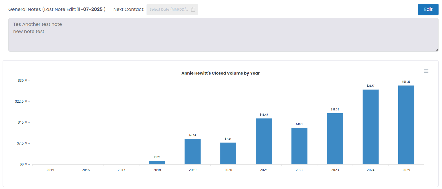 The Agent Summary tab has been re-stylized to make metrics easier to review and follow. New metrics have also been added, and the General Notes and Next Contact Date have been moved to the top of this section as well. The annual agent performance chart has also been enlarged for improved readability.