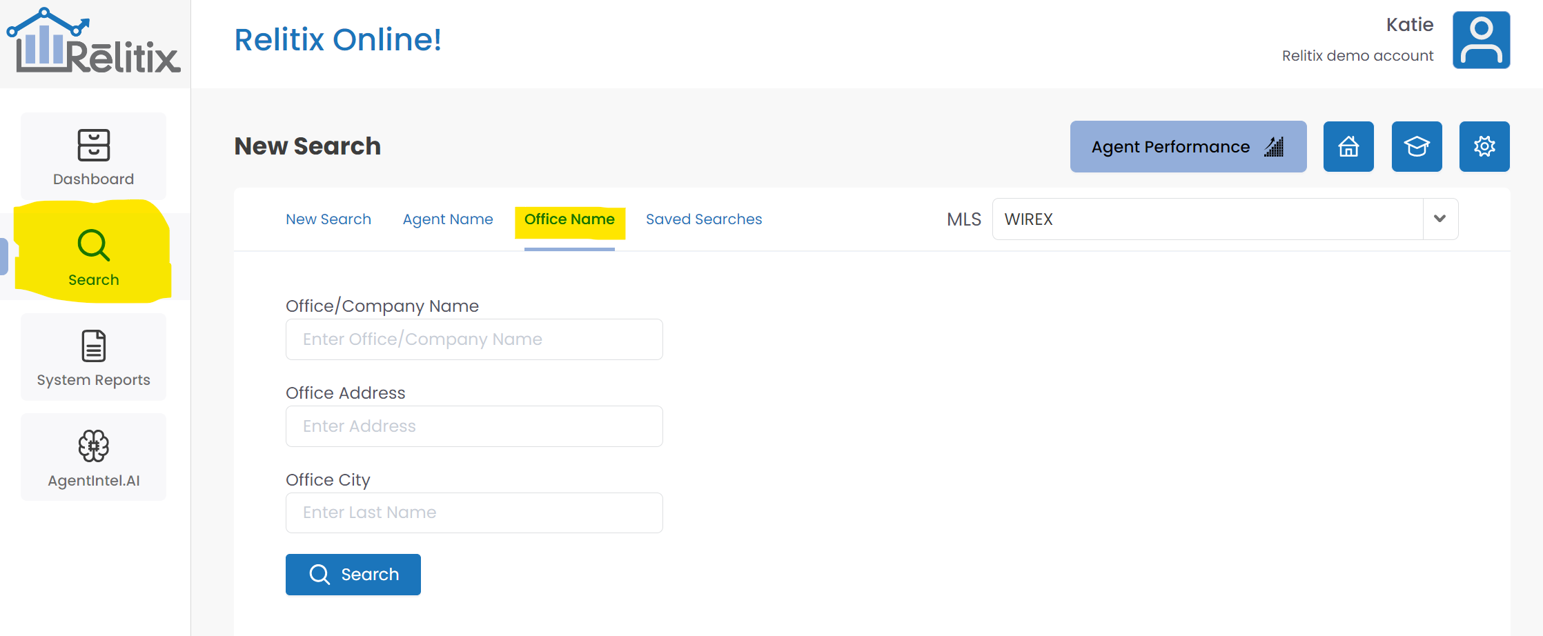 Another way to search for agents who work at a particular office is to use the Office Name field in the "New Search" tab as follows: